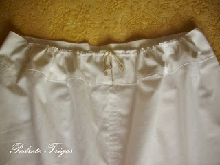 Hoy os traigo unos calzoncillos de reproducción. Los patrones me los pasaron desde Canarias, aunque éste tipo de calzoncillos eran comunes también en la península. Lo más singular de ellos es el cuadradillo que llevan en la entrepierna para conseguir holgura. Ya había visto calzoncillos así en Valencia, concretamente unos zaragüels. Me moría de ganas por confeccionar unos así, pero no sabía como encajar el cuadradillo entre los perniles, gracias a los patrones de Carmen he podido conseguirlo.